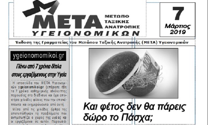 Η Γραμματεία του ΜΕΤΑ Υγειονομικών συνεχίζει την έκδοση του ενημερωτικού δελτίου της παράταξης με την έκδοση του 7ου φύλλου (Μάρτιος 2019) μετά την θετική υποδοχή που είχε η κυκλοφορία των προηγούμενων φύλλων.