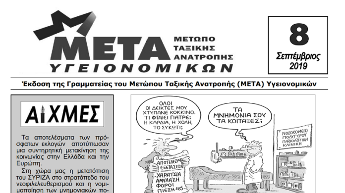 Η Γραμματεία του ΜΕΤΑ Υγειονομικών συνεχίζει την έκδοση του ενημερωτικού δελτίου τής παράταξης με την έκδοση του 8ου φύλλου (Σεπτέμβριος 2019) μετά την θετική υποδοχή που είχε η κυκλοφορία των προηγούμενων φύλλων.