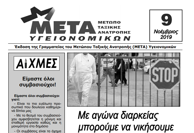 Η Γραμματεία του ΜΕΤΑ Υγειονομικών συνεχίζει την έκδοση του  ενημερωτικού δελτίου της παράταξης με την έκδοση του 9ου φύλλου (Νοέμβριος 2019) μετά την θετική υποδοχή που είχε η κυκλοφορία των προηγούμενων φύλλων.