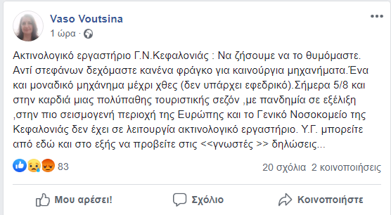 Όπως καταγγέλει η πρώην πρόεδρος του Σωματείου Εργαζομένων του Νοσοκομείου Κεφαλονιάς Βάσω Βουτσινά σε ανάρτησή της σε μέσο κοινωνικής δικτύωσης από χθες το ακτινολογικό μηχάνημα του νοσοκομείου έχει τεθεί εκτός λειτουργίας.